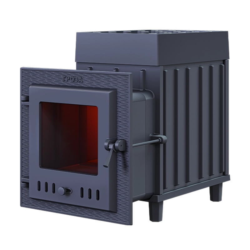 Чугунные банные печи ТМ «Гроза» — это современные печи, рассчитанные на малые и средние размеры парных. Печь имеет прочную сборную конструкцию, без резьбовых и сварных соединений, детали выполнены из легированного чугуна. Топка печей «Гроза» состоит из двух камер, разделенных пламегасителем. Радиаторные выступы каменки, направленные вглубь топки, увеличивают площадь контакта огня с каменкой и эффективность теплосъема. Для увеличения площади поверхности нагрева камней каменка снаружи оборудована чугунными шипами, направленными вверх. Между шипами укладываются банные камни или дополнительные чугунные заклады, такие как ядра и чугунные шишки. Сами чугунные шипы также являются частью заряда для лучшего испарения воды
