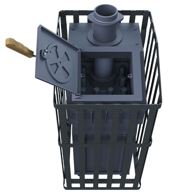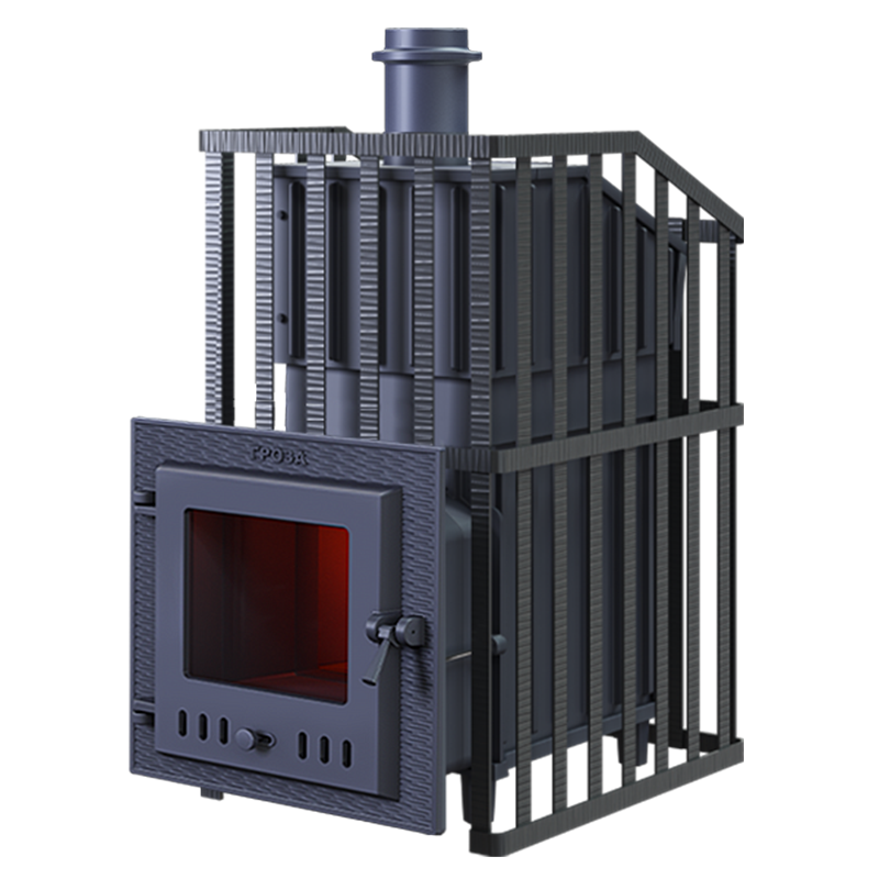 Печь для бани Гроза Ураган - расширенный комплект печи в сетке. Максимально приближенный вариант печи для режимов русской парной, имеющий непосредственно закрытую чугунным коробом каменку, дверцу для пара с ручкой из бука, увеличенную до 50см чугунную стартовую трубу.