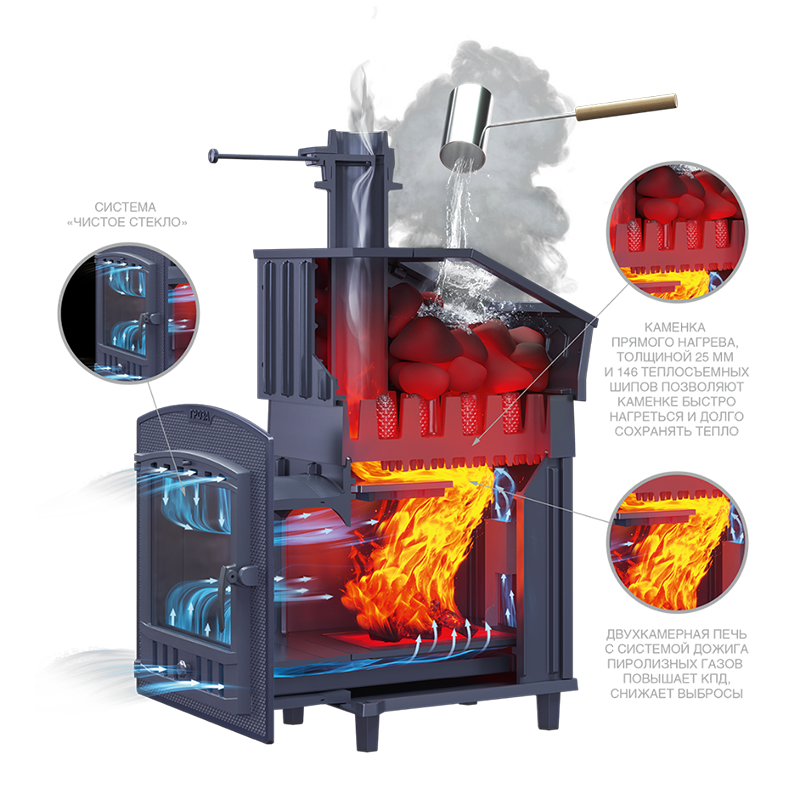 Основной принцип работы печи сохранён – получение пара с теплоёмкой каменки прямого нагрева.