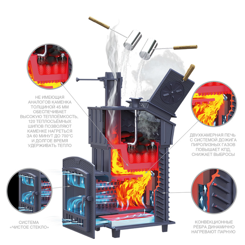 Гефест ЗК в сетке 30(П) - печь с усиленной каменкой большей массы, с единым углублением внутрь топки для дополнительной укладки чугунного заряда. Теплосъемные шипы, со стороны горения пламени, в разы увеличивают площадь соприкосновения огня с каменкой и ускоряют передачу тепла, а также способствуют лучшему дожигу смешивая потоки пламени и воздуха поступаемого из воздушника. Эти усовершенствования значительно повышают мощность парообразования печи и выдают большее количество пара при непрерывной подаче воды. Каменка печей Гефест-ЗК является незаливаемой.