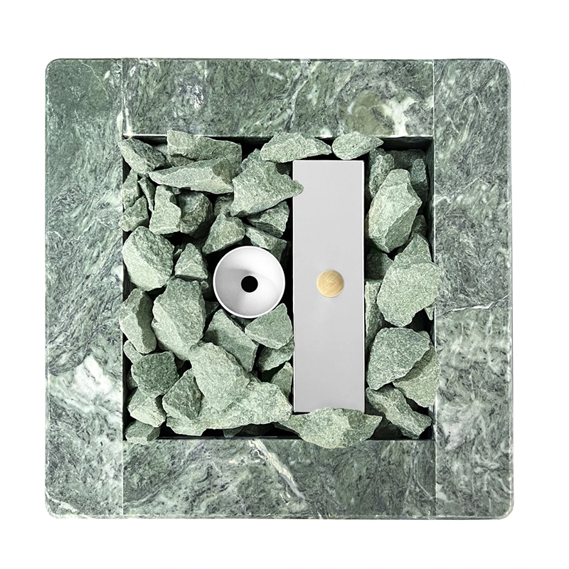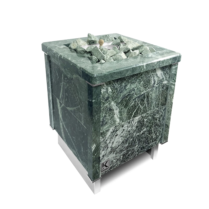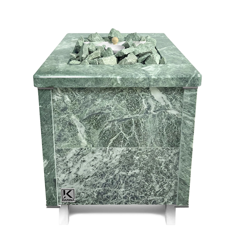 Электрическая каменка со всех сторон облицована натуральным змеевиком. Печь с подобным дизайном стильно смотрится в парильном помещении. Змеевик уже долгие годы используется для внутренней отделки бань. Его называют «аптекарским камнем» за его целебные качества. Минерал оказывает обеззараживающий эффект, положительно влияет на кости, оказывает успокаивающее воздействие и укрепляет иммунитет.