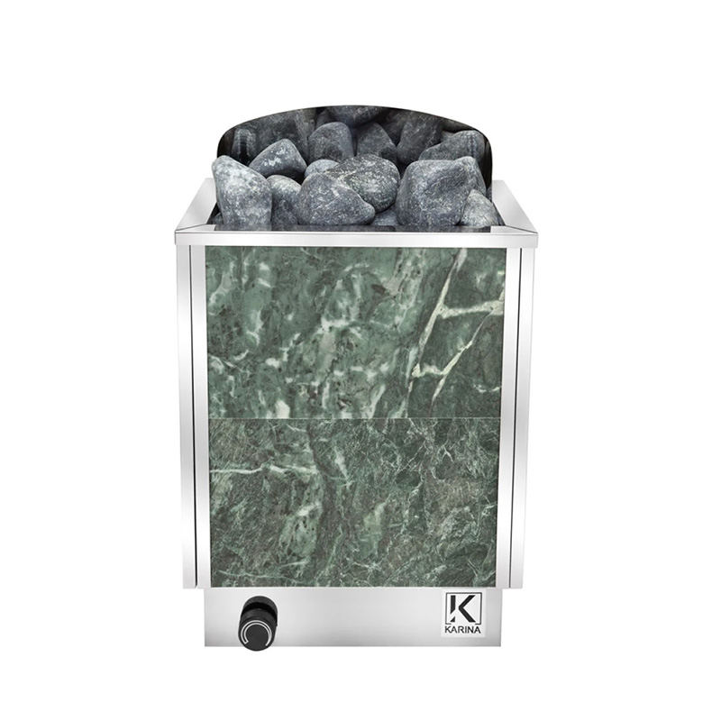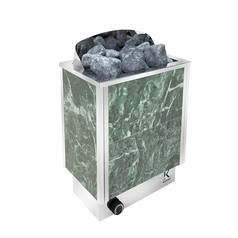 Корпус каменки изготовлен из качественной нержавеющей стали. Облицовка передней стенки печи выполнена из плит из змеевика. Данный минерал уже долгое время используется как материл для печей и имеет множество достоинств: это и целебные свойства, и параметры, отвечающие за теплообмен и способность камня выдерживать резкие и частые температурные перепады.