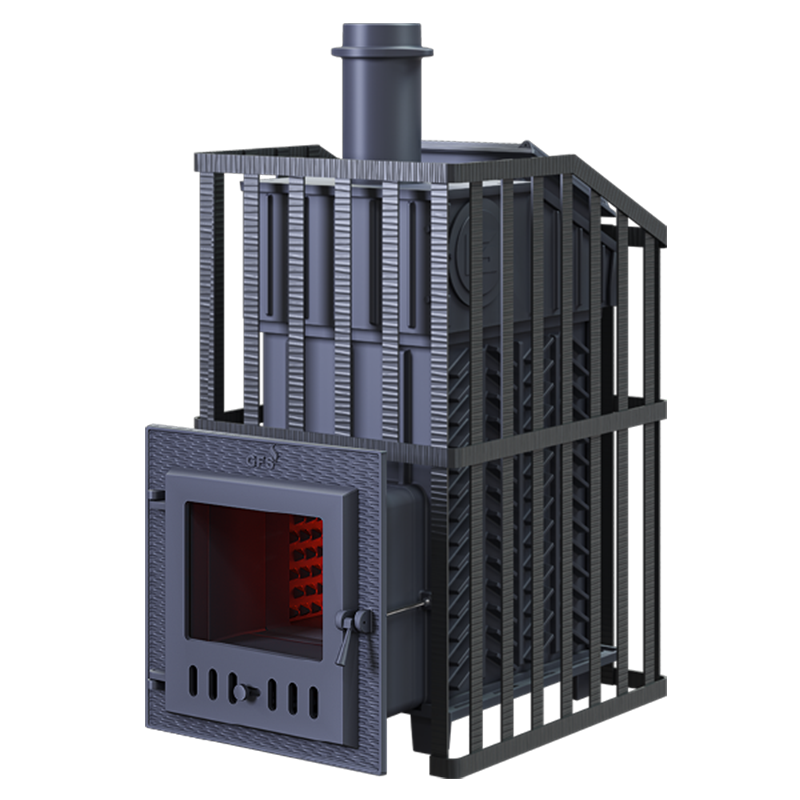Гефест ЗК в сетке 30(М) Ураган - расширенный комплект печи Гефест ЗК в сетке. Максимально приближенный вариант печи для режимов русской парной, имеющий непосредственно закрытую чугунным коробом каменку, дверцу для пара с ручкой из бука, увеличенную до 50см чугунную стартовую трубу. Печь легко модернизируется до полноценной печи предназначенной для Русской бани путем замены стальной сетки на каменную облицовку без демонтажа дымохода.
