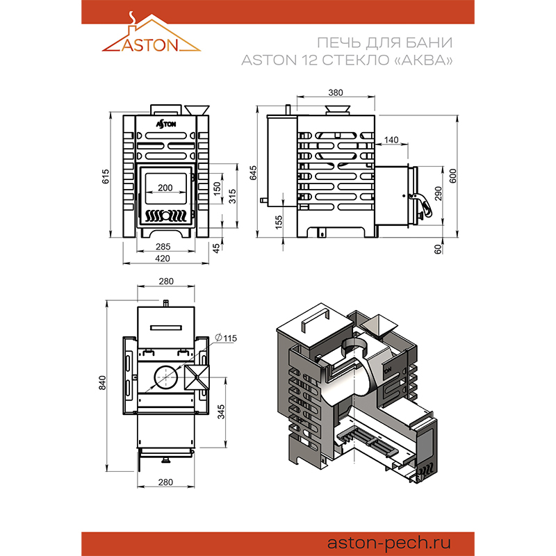 Печь для бани ASTON 12 подходит для обогрева парных объемом до 14 м3.