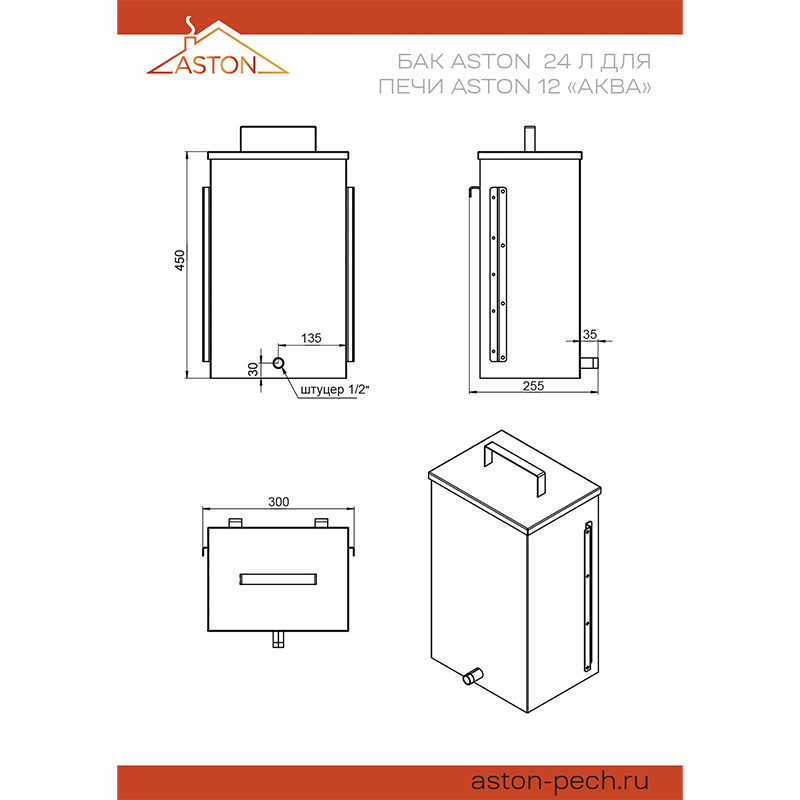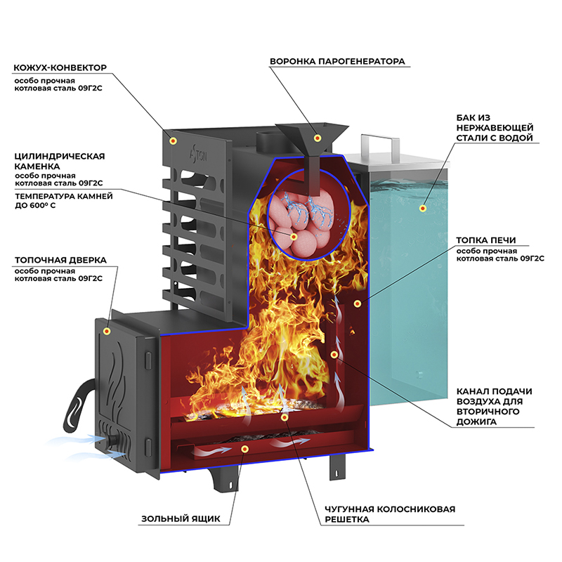 Сетка-каменка обрамляет топку и вмещает в себя 60-70 кг. камней. Также у АСТОН есть внутренняя закрытая каменка, подача воды в которую осуществляется через воронку, вынесенную наверх. Такая каменка позволяет получать легкий и мягкий пар.