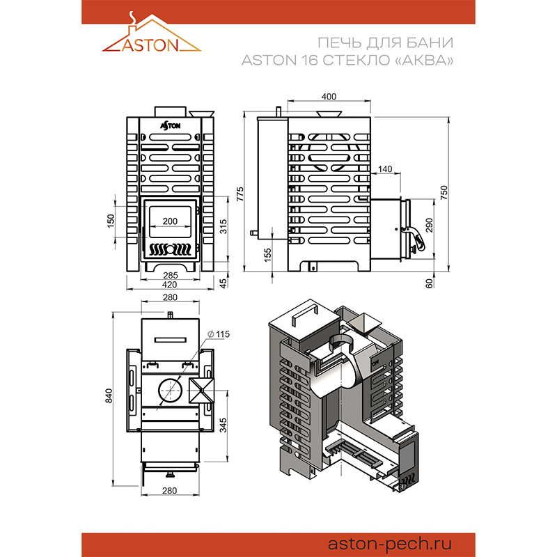 - Диаметр дымохода (мм) Ø115 мм