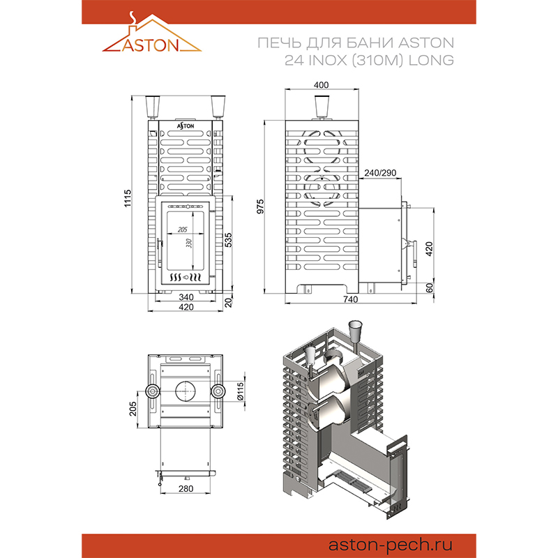 Печь для бани ASTON 24 НЕРЖ. (310М) Лонг
