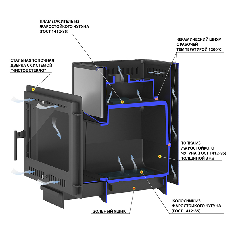 Преимущество печи в том, что топка печи состоит из 3-х элементов. На стыке между ними используется керамический шнур с рабочей температурой 1200 градусов. То есть топка печи абсолютно герметична! Для фиксации деталей между собой применяется болтовое соединение, что даёт 100% гарантию безопасности при эксплуатации.